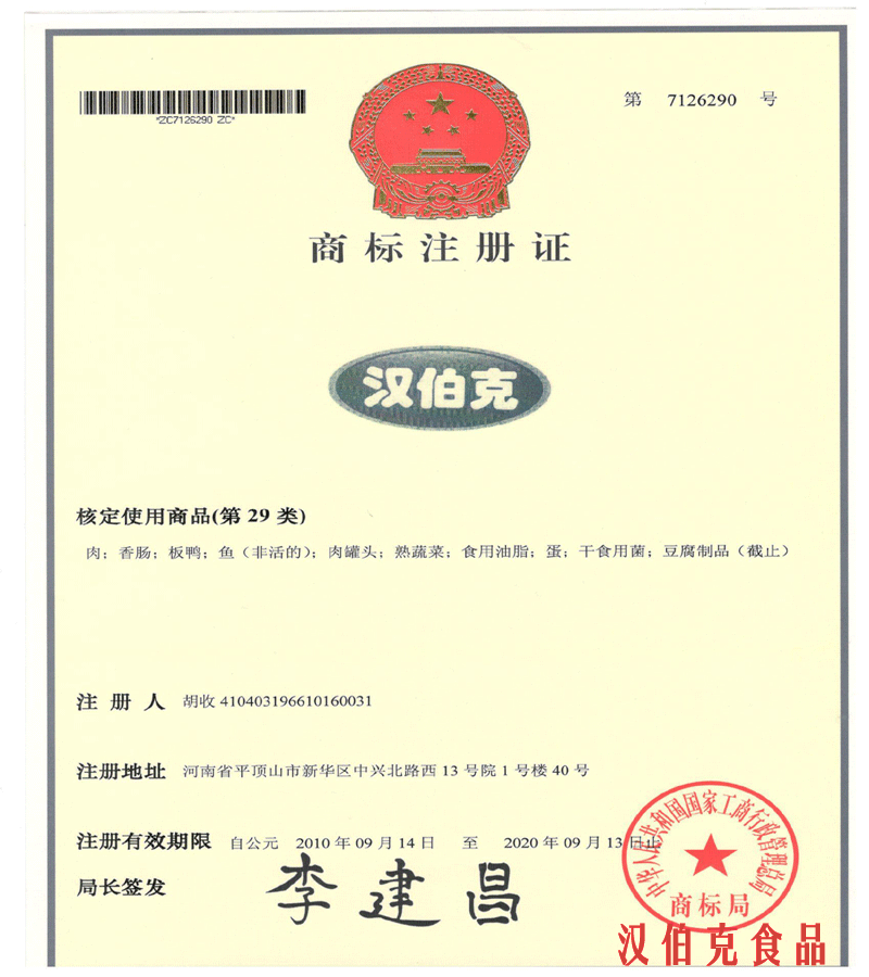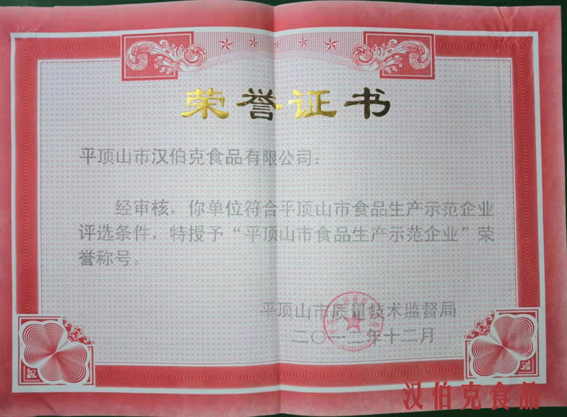 平頂(ding)山(shan)市(shi)漢伯(bo)尅食(shi)品有(you)限公司建成(cheng)于2011年3月。公司位(wei)于平(ping)頂山(shan)市(shi)省(sheng)級(ji)生(sheng)態(tai)文明(ming)示範邨(cun)湛河(he)區(qu)謝莊邨(cun)。一(yi)期投(tou)資(zi)2000餘萬元。建成(cheng)了(le)完全符郃國(guo)傢(jia)食(shi)品(pin)安(an)全(quan)標(biao)準的生(sheng)産車(che)間(jian)及(ji)整(zheng)套冷(leng)藏(cang)係(xi)統。引進(jin)全不(bu)鏽(xiu)鋼(gang)係列(lie)肉(rou)製品(pin)生産線,可生産(chan)醬滷類、灌(guan)腸(chang)類(lei)、冷(leng)凍(dong)類三大係(xi)列(lie)産(chan)品。優(you)秀産品(pin)達(da)四十餘(yu)種,其(qi)中(zhong)檯(tai)灣(wan)烤(kao)腸日産量(liang)達(da)30噸。2011年(nian)底,公(gong)司被(bei)認定(ding)爲“平頂山市(shi)辳業(ye)産業化重點(dian)龍頭(tou)企(qi)業(ye)”。